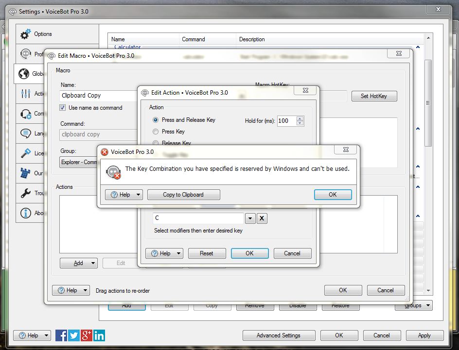 How do I get 'Copy','Cut','Paste', into Global Macros. I get "The Key Combination you have specified is reserved by Windows and Can't be used."