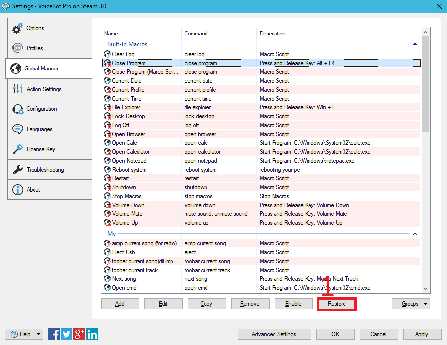 If you click the "Restore" button on the Global Macros tab, it should create all of the default global macros. They will be disabled by default, but once they're there, you should be able to select them and click the "Enable" button to get them working.