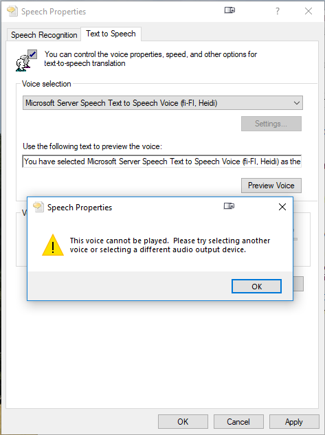It seems to be a problem with Text-to-Speech in Windows 10. When I check in the Windows control panel, I get the attached error. Do you get that as well?