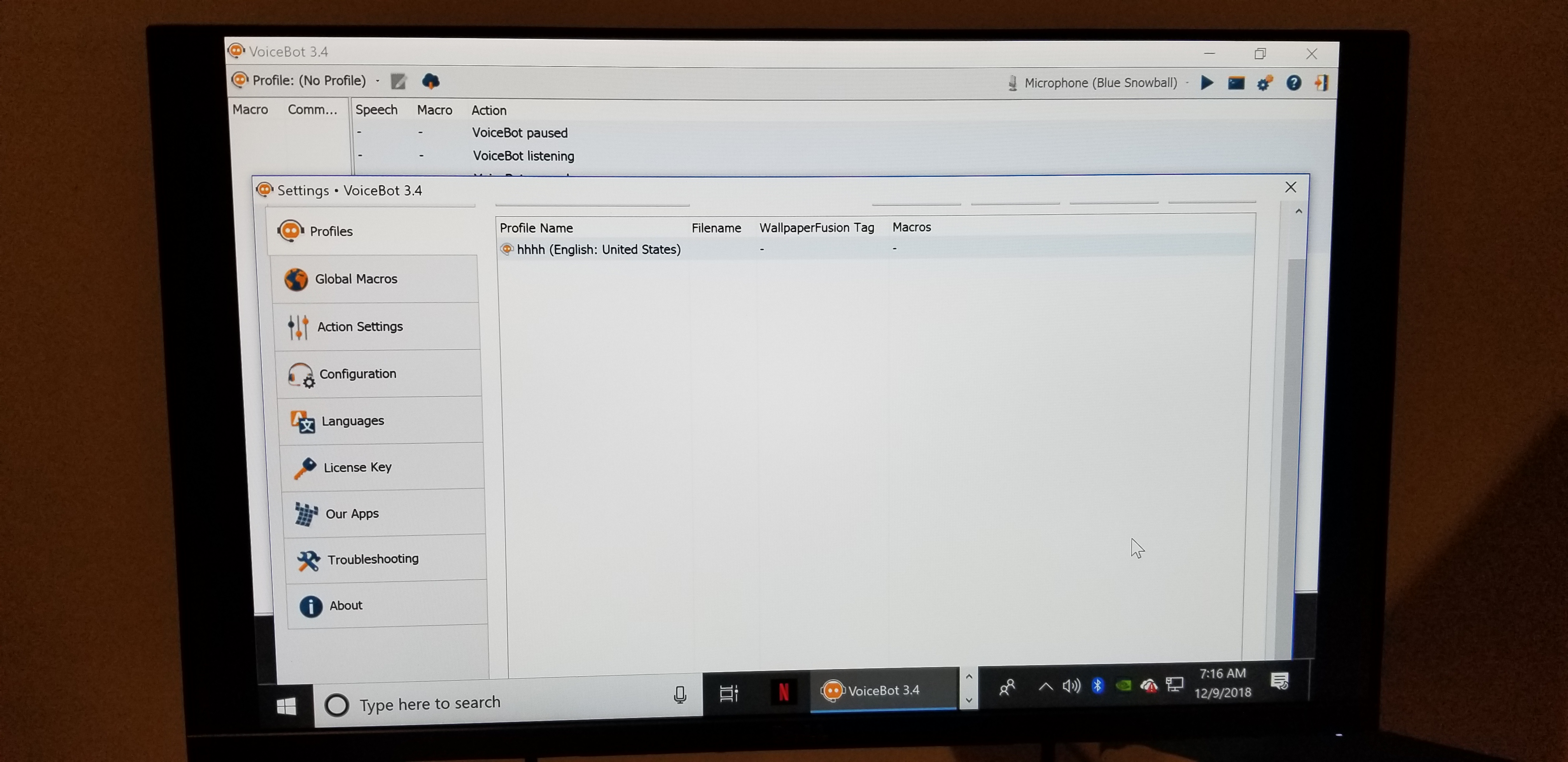 I just downloaded voicebot for the first time and I'm stuck at this screen. I make a profile. But then it doesn't show up in that voicebot streaming listening screen. See attachment. My profile HHH in the front window I can't get to show up in the window behind it if I X Out the front window the profile disappears forever.