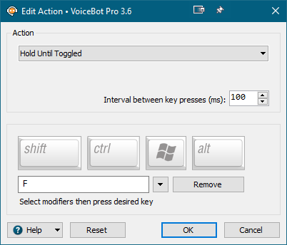 https://www.voicebot.net/Help/#settings-profiles-edit-macroedit-actions - Explanation "Toggle Key" (German: "Taste umschalten" or "Umschalttaste" for German website translation)